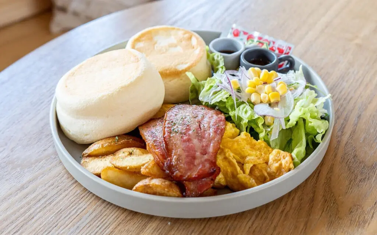 じっくりと焼き上げられたスフレパンケーキは、口の中で広がる小麦の香りと、シュワッと溶けていく軽い食感が特徴。旅の疲れを癒やし、心とお腹を満たしてくれるひと皿です。