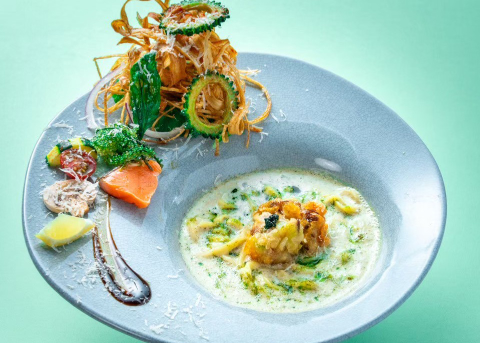 - 沖縄の恵み:ソーキそばの看板である「ソーキ」はもちろん、沖縄を代表する野菜の「ゴーヤ」、海の宝石「海ぶどう」など、沖縄の食材をふんだんに使用したマリアージュを楽しめます。