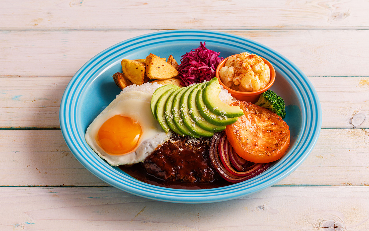 - お食事系も充実!肉厚なハンバーグが自慢の「ロコモコ」や、ガーリックシュリンプなど、本場ハワイの味を再現したボリューム満点なメニューが揃っています。